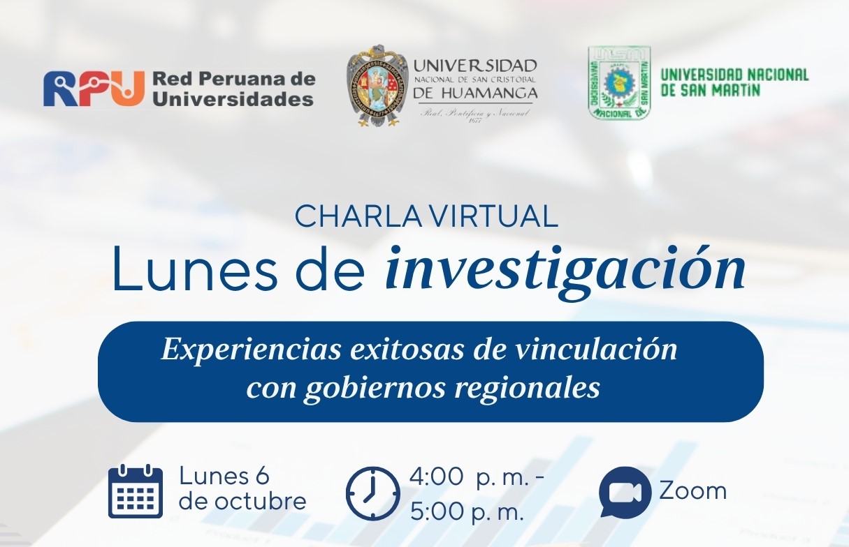 El pasado lunes 6 de octubre se realizó una nueva edición del Lunes de investigación de la Red Peruana de Universidades (RPU), dedicada al tema “Experiencias exitosas de vinculación con gobiernos regionales”. La sesión reunió a destacados representantes de universidades miembros de la red: el Dr. Humberto Sánchez Villanueva, vicerrector de investigación de la Universidad Nacional Daniel Alcides Carrión, y el Ing. Carlos Armando Ríos López, de la Universidad Nacional de San Martín.