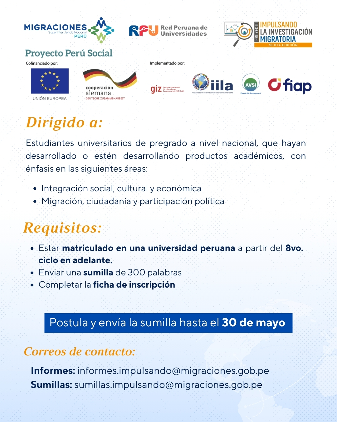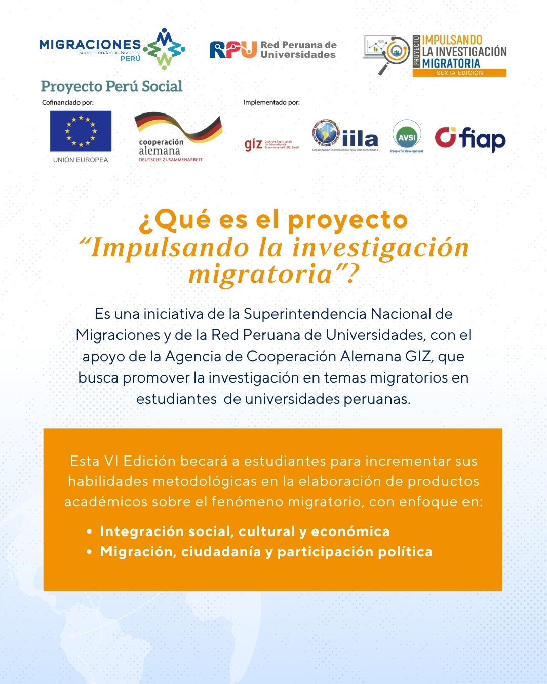 Esta iniciativa busca seleccionar a estudiantes de universidades peruanas para fortalecer sus habilidades metodológicas y acompañarlos en la elaboración de productos académicos de alto nivel sobre el fenómeno migratorio en el Perú.