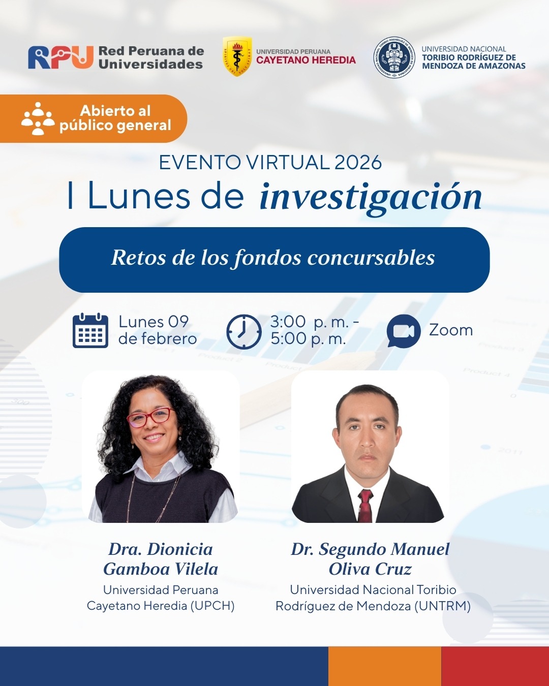 Invitamos a docentes, gestores y equipos de investigación, así como al público interesado, a participar en el I Lunes de Investigación – Evento Virtual 2026: «Retos de los fondos concursables”. La charla estará a cargo de la Dra. Dionicia Gamboa Vilela (UPCH) y el Dr. Segundo Manuel Oliva Cruz (UNTRM), quienes compartirán reflexiones clave y […]